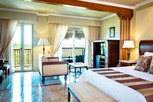 The Emerald Junior Suites at Valentin Imperial Riviera Maya are located in a natural setting in two storey oceanfront buildings, almost on the beach but with palm trees in between, offering a partial ocean view. King size beds only. Ground floor rooms have a hammock and one can literally step from the terrace onto the sand.